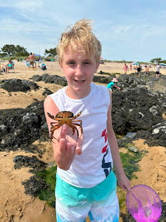 Nie chciala jednak pounosic sie na desce, bo stwierdzila, ze jest na to za "stara". Tymczasem w wodzie sporo bylo doroslych oraz nastolatkow, ktorzy nie mieli takich obiekcji. :D Nik za to wszedl po kolana, po czym stwierdzil ze za zimno. Dolaczyl jednak do mnie kiedy spacerowalam wzdluz brzegu. Kiedy sie szlo, a woda byla plytka, jej temperatura byla nawet do wytrzymania. ;) Ostatecznie nawet Bi wyszla z wody i usiadla na lezaku czytajac. My z Nikiem pospacerowalismy, a potem przysiedlismy obok. Ja cieszylam oczy widokiem oceanu, Mlodszy uparcie sypal piachem na wszystkie strony. :D W koncu trzeba bylo wrocic, tym bardziej ze do maksymalnego odplywu zostalo 1.5 godziny, a z Kokusiem planowalismy pojsc "na kraby". Odpoczelismy troche w cieniu obok przyczepy, po czym ponownie ruszylismy na plaze, ale ta przy rzece, ze skalkami. Okazuje sie, ze na kraby trzeba miec w reku mnostwo sposobow. Rok temu odkrylismy, ze mnostwo ich zakopanych jest pod kamieniami. Tym razem jednak jakos niewiele bylo mniejszych glazow ktore daly sie przewrocic, a pod tymi, ktore udalo nam sie podniesc, bylo pusto. Jednego krabiszona znalazlam ja, zupelnym przypadkiem. Przejechalam siatka pod wodorostami, probujac je wyploszyc, a wyjelam ja z krabem w srodku. :D Przekonalismy sie przynajmniej, ze sa tam, tylko trzeba pogrzebac w brunatnicach. ;)